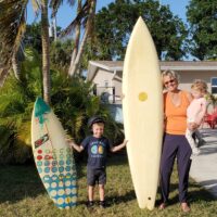 Before long Chuck and Rebecca left the cold winter surf of Lake Michigan and moved to Florida, not far from Sebastian Inlet. Rebecca recalls “So, surfing is what brought us to this area and warm water kept us here. He kept surfing for the rest of his life, but the boards got longer and the waves gentler. Our daughter married a surfer and gave birth to another one. I love seeing the tradition continue.”