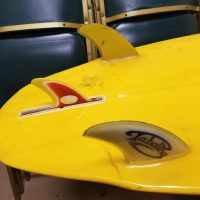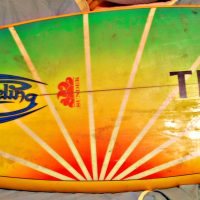 The board is typical of the designs being made just after the introduction of Simon Anderson’s famous thruster 3-fin design in that it has two glassed on fins to ride in a twin fin configuration with the option to use a third fin in a center box. The twin was a highly refined design in Florida at the time and this board would probably be a good rider even today. Note that the fins are a composite foam/fiberglass construction. The board is very light even by today’s standards.