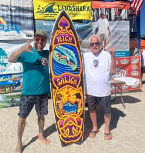 A live auction for a colorful surfboard honoring the Salick family, and designed by globally-renowned tattoo artist Mark Longenecker, collected $1,800 from the winning bidder.