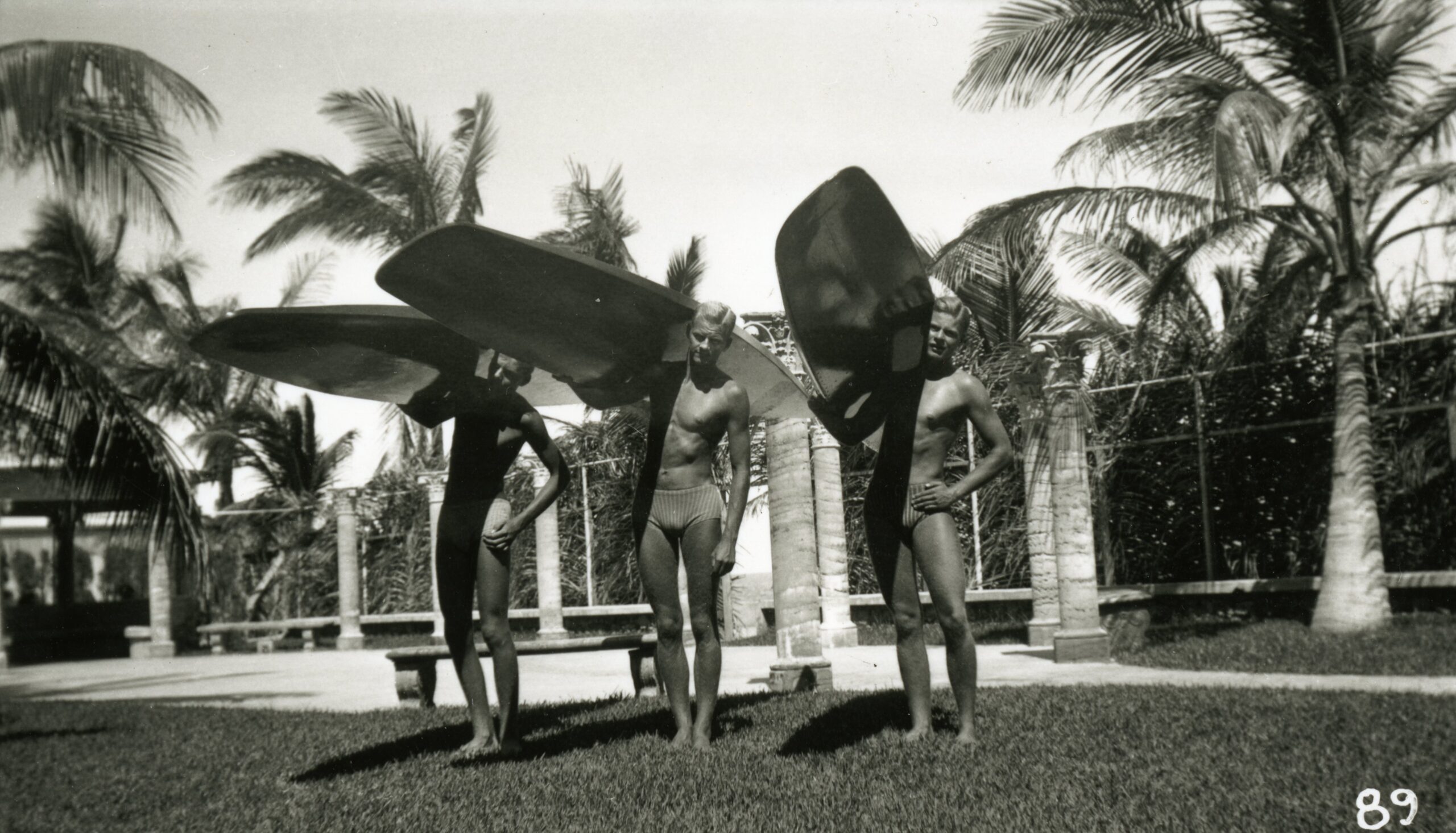 Splitting their adolescent years in the 1920s and ’30s between Miami Beach and Lake Michigan, William Whitman and his brothers Dudley and Stanley became acquainted with watersports at an early age. They learned to bodysurf and bellyboard, catching lake and ocean waves on mats and boards handmade by William himself. For William and Dudley in particular, an auspicious visit from a trio of Virginians changed the direction of their lives.