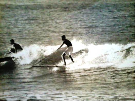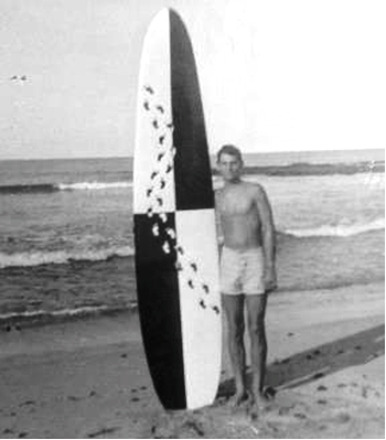 After that day, I begged my Dad to buy me a surfboard and he knew I would bother him until he did. So, he found a used board an Air Force serviceman was selling and luckily it was just a few miles from where we lived in Wahiawa. Wahiawa back then was just a small, old and very “rustic” plantation town up in the mountains, surrounded by pineapples. Up that high, the sky is very blue during the day but at sundown it begins to cool off and usually rains at night. Now that I think about it, Wahiawa is still the same, just minus the pineapples. While I don’t remember the exact dimensions of that board, it was love at first sight. It was fiberglass over balsa with a few dings and not in the best of shape. Painted all white on the bottom with Menehune feet “walking” in an “S” shaped design, going the length of the board over a black and white checkered pattern on the top. No rocker – I didn’t know what that was anyway and didn’t care. I just knew it was the board for me. My father bought it on the spot. Dad, being a smart man, saw value in this surfboard and hoped surfing would keep me out of trouble, not that I was “always” in trouble! That was my first “Feral Pig” surfboard. I took good care of my new board while at the same time learning how to surf it.